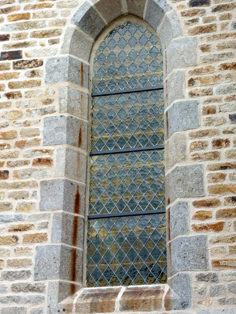 In collaboration with the late Architect, Bernard Le Moen, I was commissioned to make these new windows for the Parish church of Carnoet, in Brittany, France. At the same time, we also restored the large figurative Altar windows. He was a fantastic architect for Heritage projects, a very close friend, with whom I had worked on many churches. It was a very sad loss that he passed away a few days after the completion of this project.